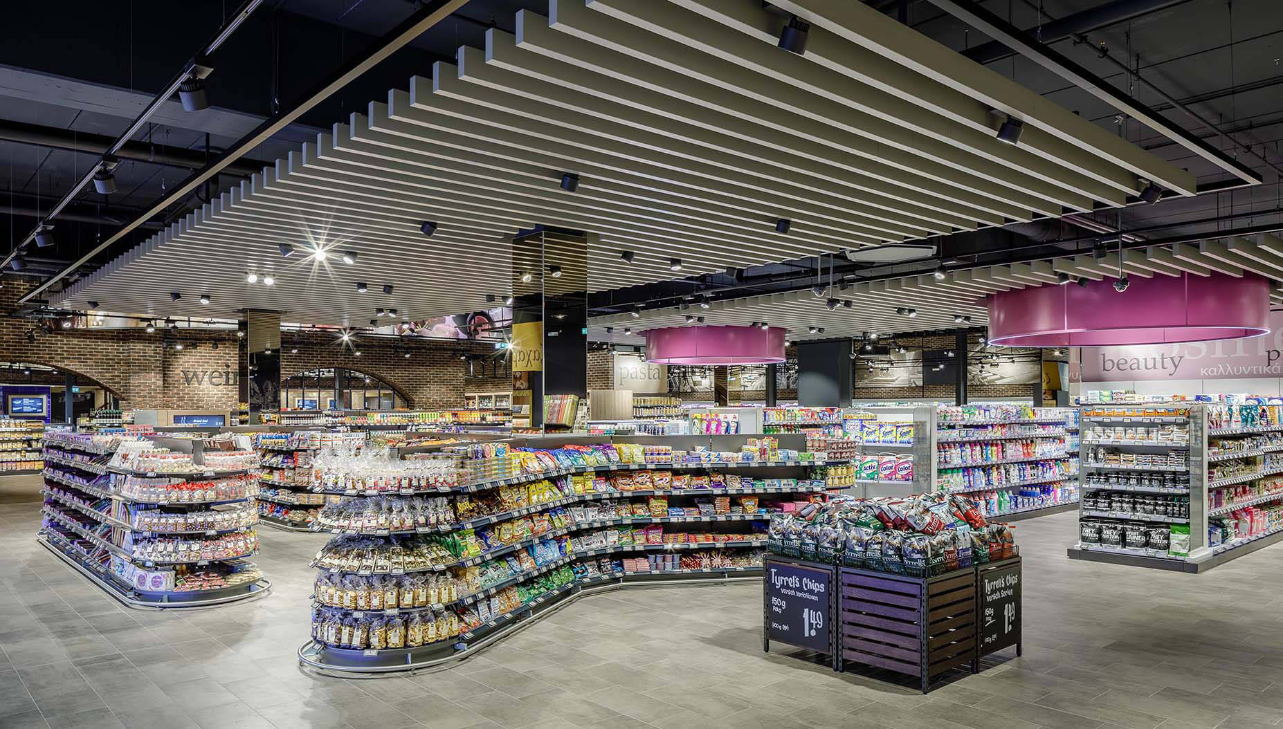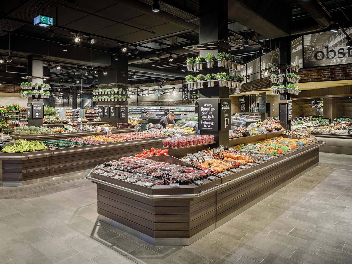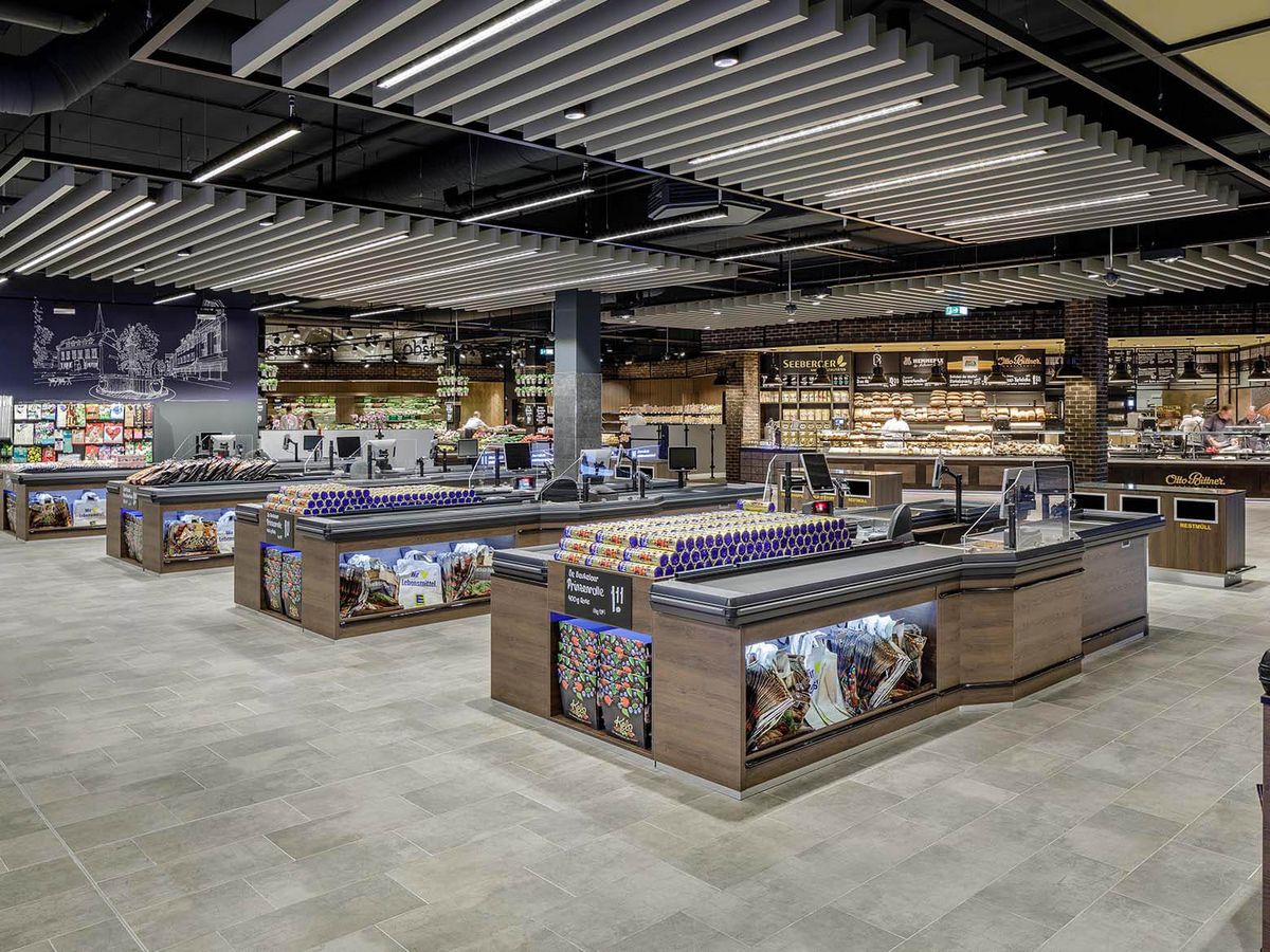 Edeka Kels – der Marktplatz für Frische. Um ein angenehmes Einkaufserlebnis zu schaffen, das die Kunden des Lebensmittelmarktes inspiriert, haben wir viele verschiedene Leuchten aus der Ansorg-Familie eingesetzt.