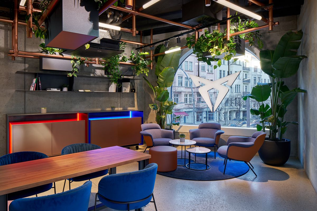 The planning and implementation of the lighting concept were executed with the utmost precision and attention to detail. Energy-efficient lighting with exceptional light quality and high color rendering was chosen for the sales areas in the flagship store. With ceiling heights of up to 3.59 meters, Ansorg uses high-lumen lights with cool light to highlight the sheen of the three CUPRA vehicle models on display. In the lounge area upstairs, warm lighting prevails to foster a cozy ambiance.