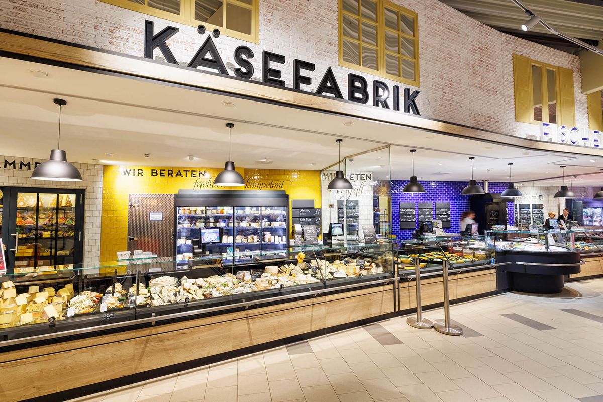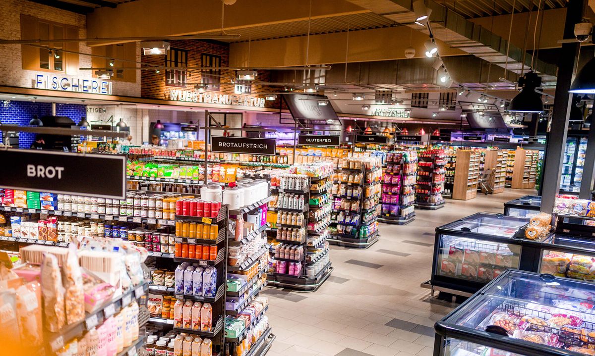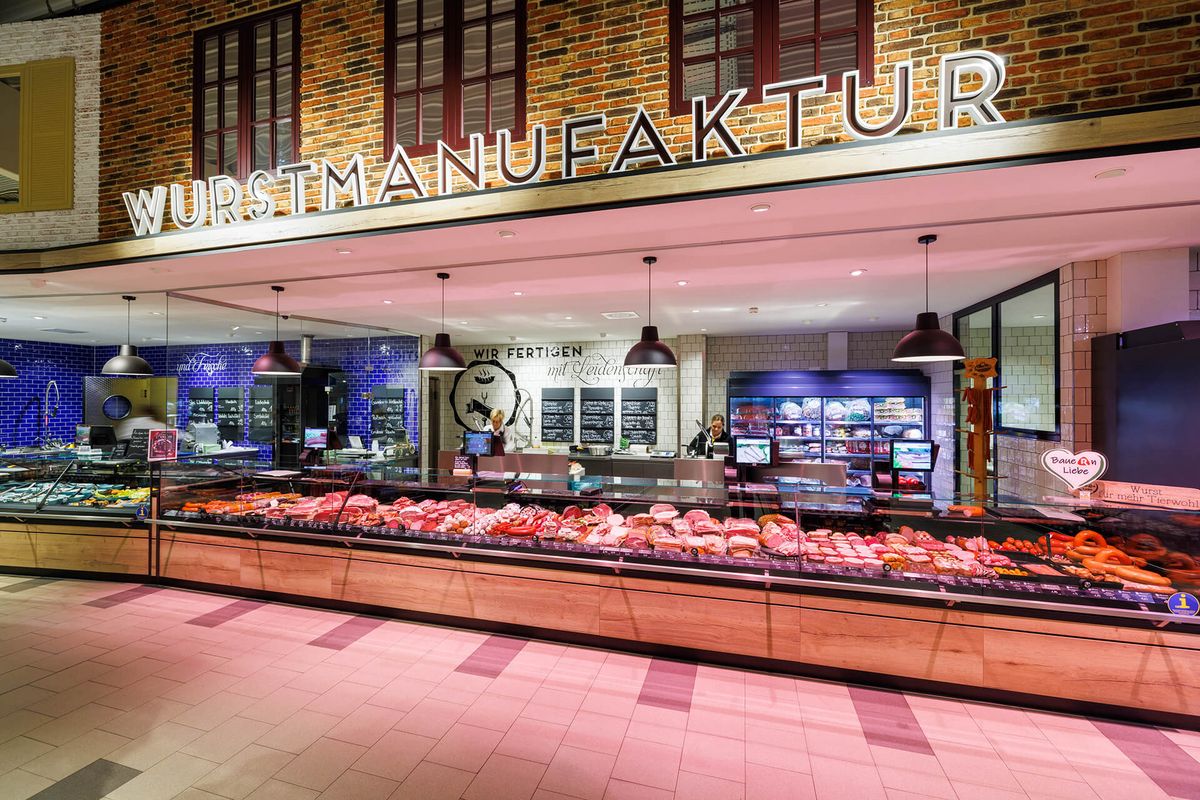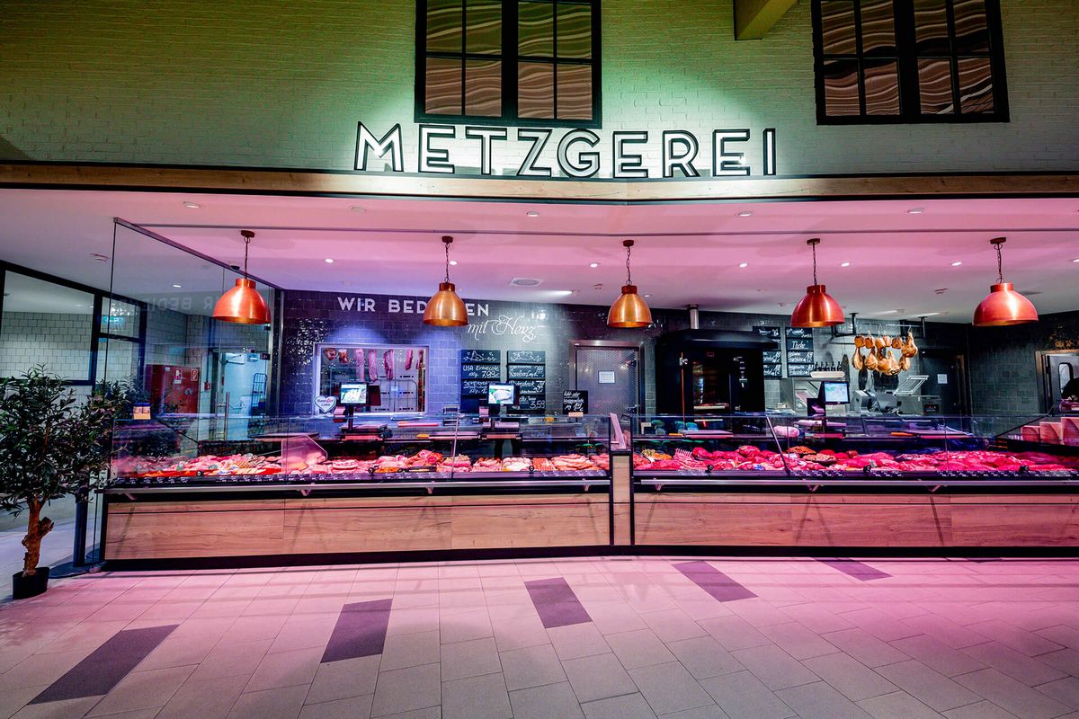 The total room height is 5.50 metres, with luminaires installed in the central areas at a height of 3.20 metres and power rails for luminaires in the peripheral zones at a height of 3.85 metres. This installation arrangement creates a visual sense of space as well as optimising the visibility of the decoratively staged brick walls and the house façade above the fresh produce counters. Everything comes together to produce the intended marketplace-like atmosphere. Also, the use of different building materials and luminaires enables the creation of different, product-specific light moods.