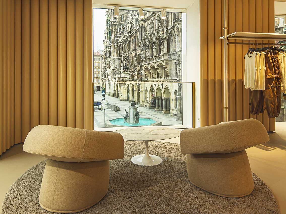 The design follows the principle of "Outside In" and continues the pattern mix, colours and shapes of the historic façade of the building, designed by Max Lacher in 1956, inside. Floor-to-ceiling windows open up the view of the majestic Marienplatz and complete the high-quality overall impression.