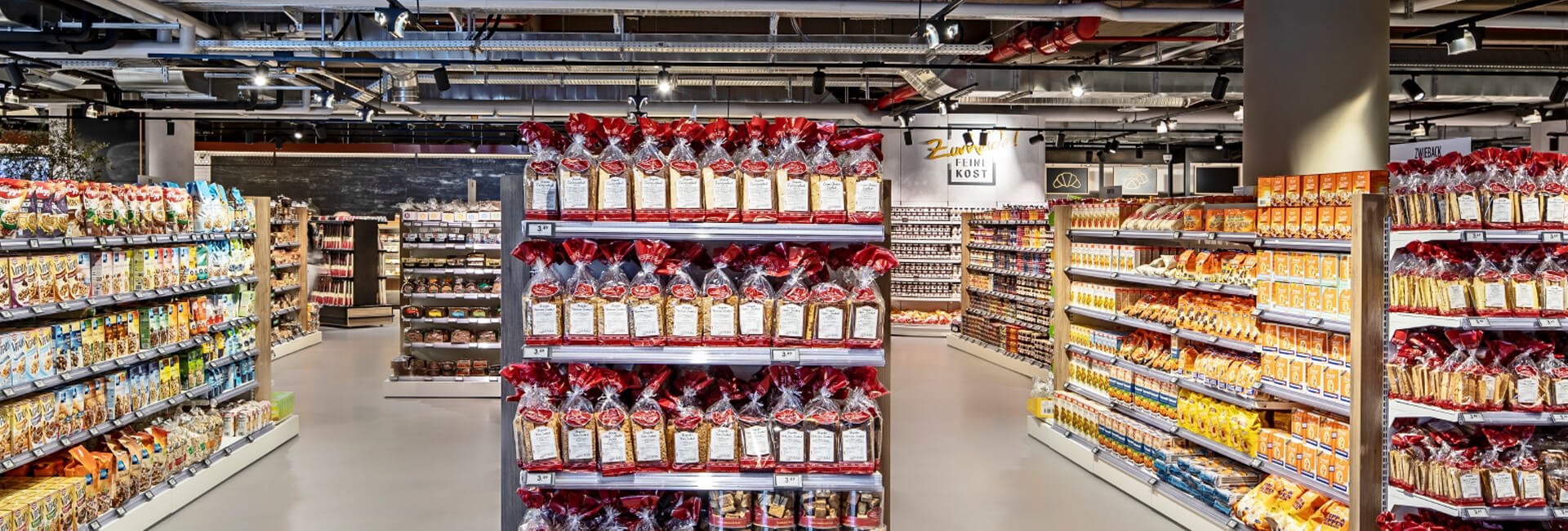 Esta área estrella de la tienda es un preludio de lo que nos espera en las siguientes estanterías, por lo que debería tratarse más bien como escaparate interior y no como mera superficie de almacenamiento. La iluminación contribuye en gran medida a convencer a los clientes de que acudan al pasillo respectivo.