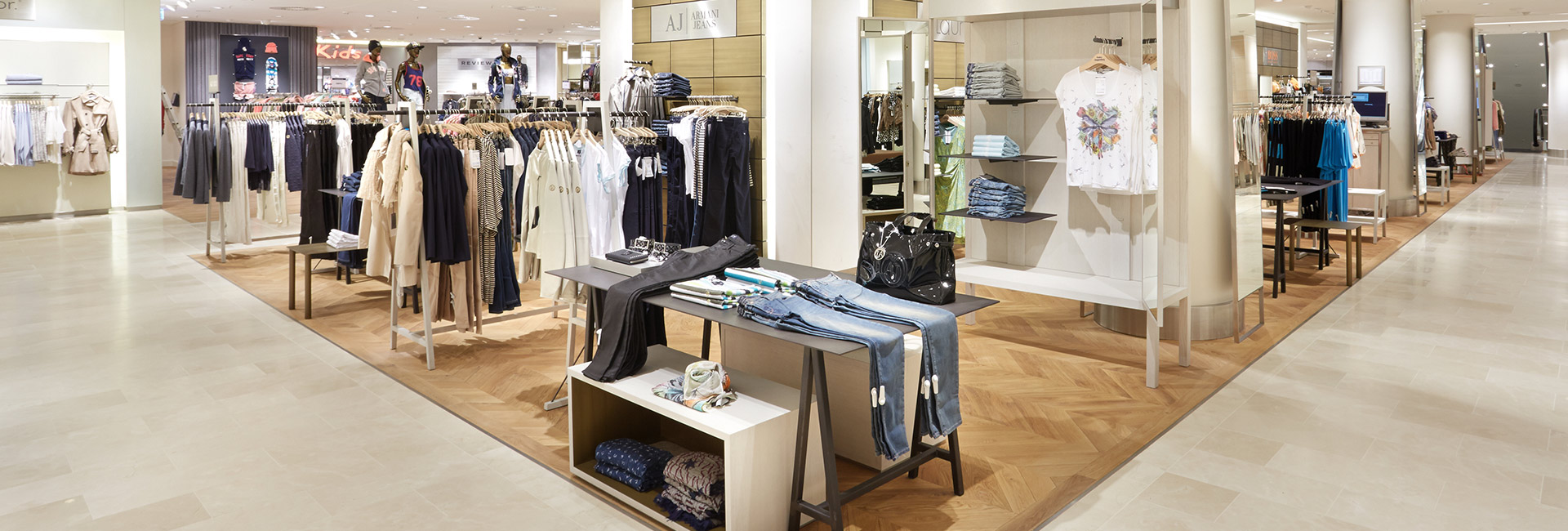 Des solutions d’éclairage mûrement réfléchies valorisent les couleurs et textures respectives des différents produits, quelle que soit leur nature, qu’il s’agisse de vêtements, de chaussures ou d’accessoires.