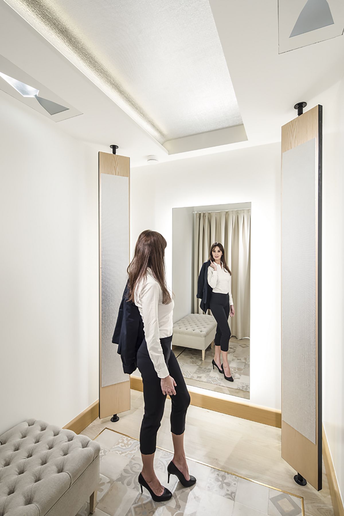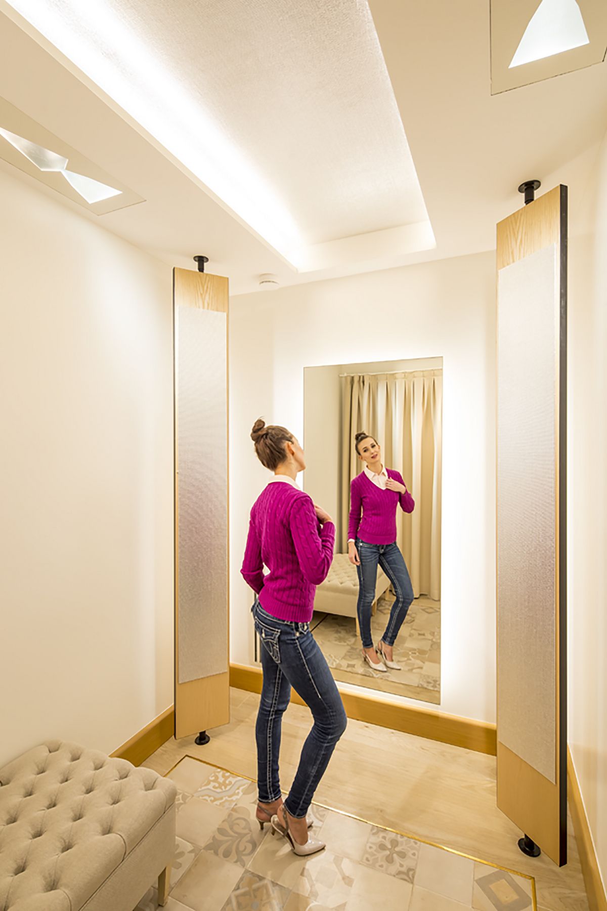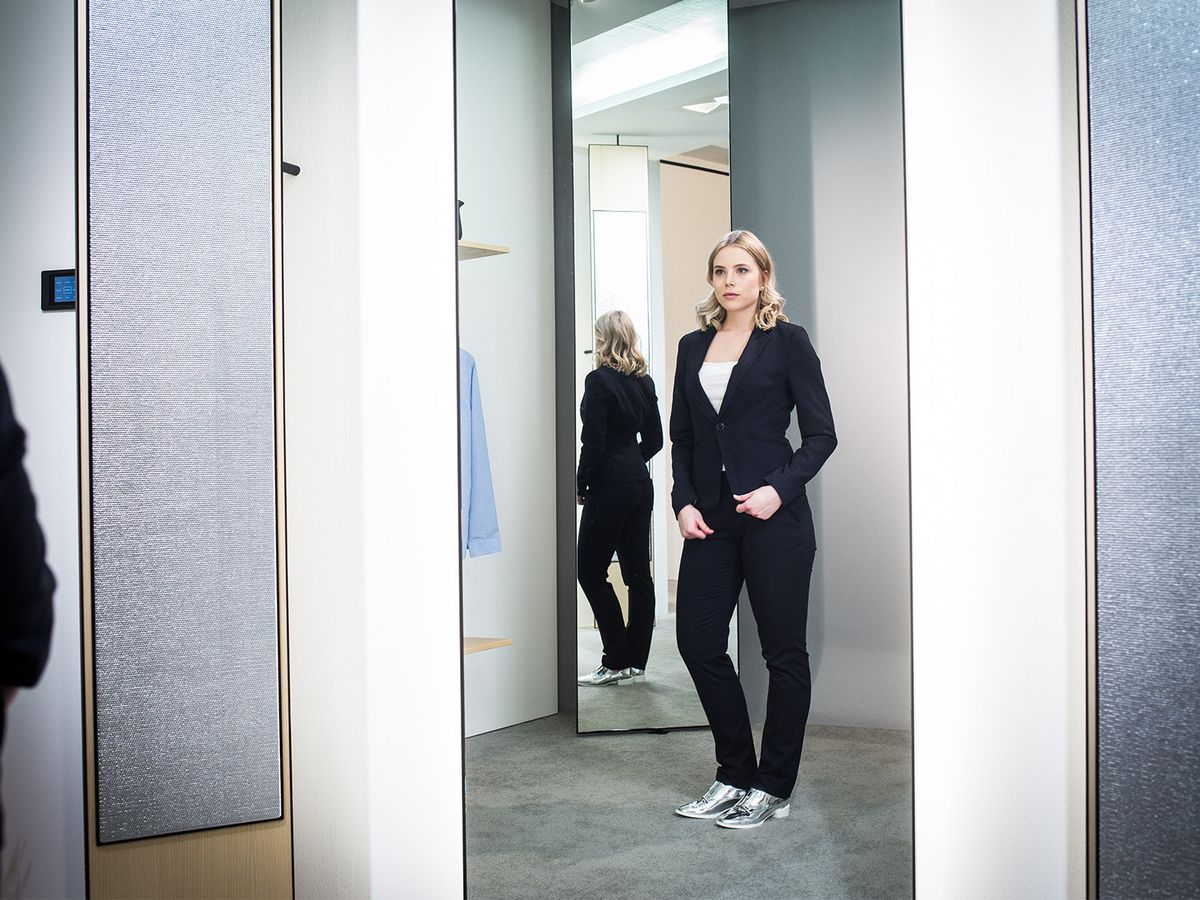 Die Anzahl der eingesetzten Lichtmodule kann individuell definiert werden. Die Lichtfarben können je nach präsentierter Mode frei gewählt werden, genauso wie eine Einbau- oder Anbau-Variante für die Decke. Zusätzliche Flexibilität und Interaktion bietet optional eine integrierbare Lichtsteuerung mit verschiedensten Szenenprogrammen. So können die Kunden in der Kabine passend zur Kleiderauswahl individuelle Lichtszenarien für Business, Sport-, Casual- und Abendgarderobe einstellen. Fashion-Store-Betreiber erhalten mit dieser flexiblen und modularen Umkleidekabine nahezu grenzenlose Gestaltungsfreiheit für eine umsatzstarke Zukunft.