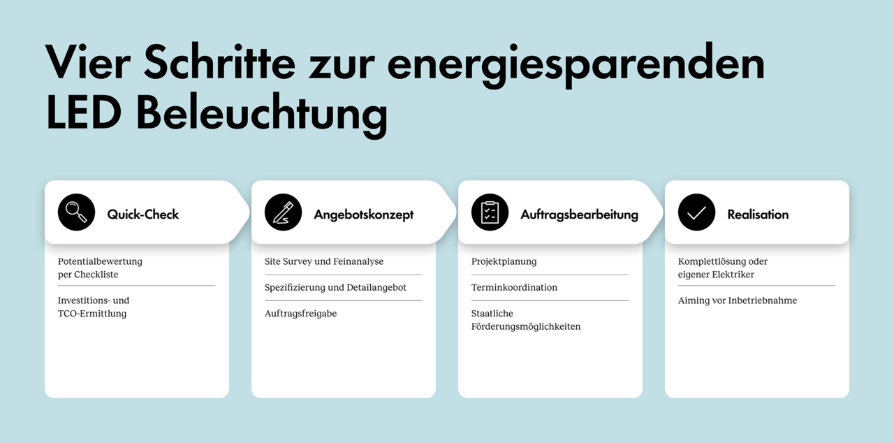Per Quick Check geben wir Ihnen eine verlässliche Indikation zu Wirtschaftlichkeit und ROI Ihrer Investition. Die Durchführung der Umrüstung erfolgt unkompliziert aus einer Hand. Durch ergänzende Finanzierungsangebote können Sie sofort nach Inbetriebnahme monatlich Geld einsparen.